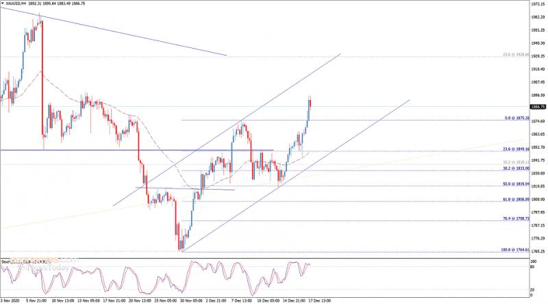 因市场预期冠状病毒救援协议即将达成, 黄金价格周四上涨逾1%,至一个月高点。现货黄金收报1885.27美元/盎司,上涨20.62美元或1.11%,盘中触及一个月高点1896.14美元/盎司。