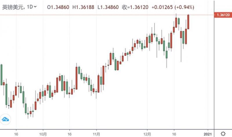 英镑目前继续攀升,目前已经突破1.36关口,日内较低点涨超100点。