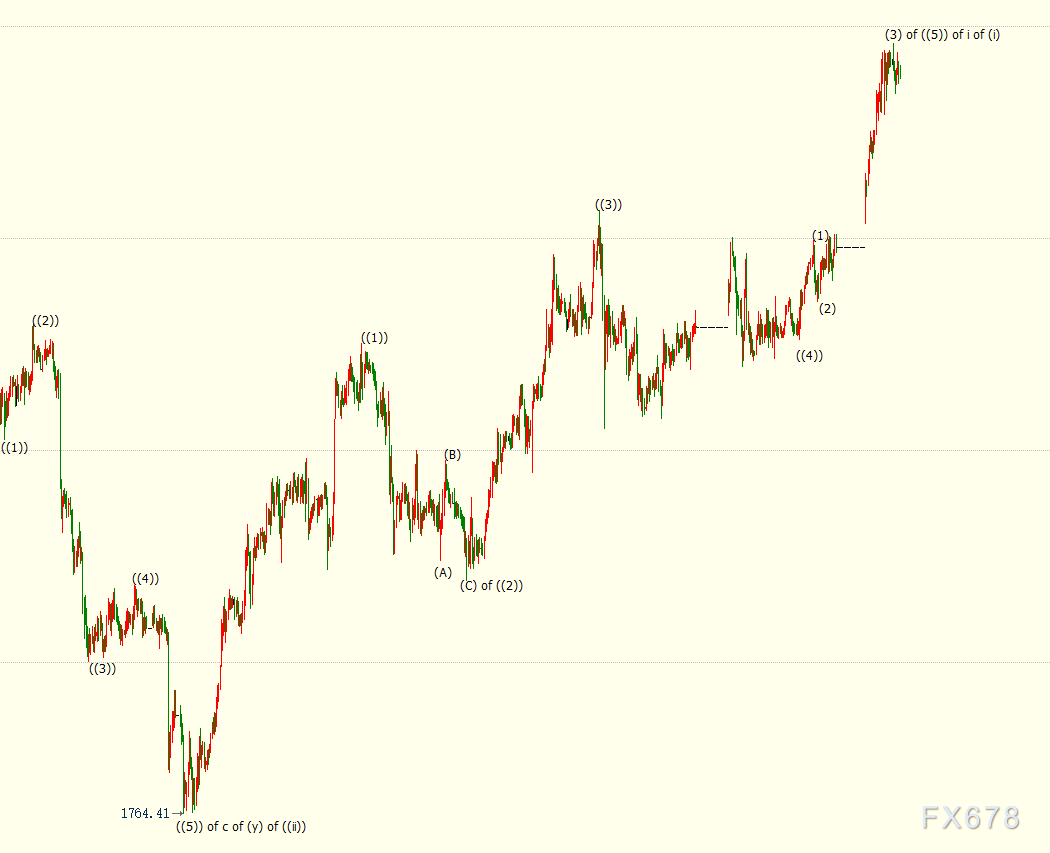 小时图上看,金价处于自1885美元开启的上行((5))浪走势,((5))浪是自1764美元开启的上行i浪的子浪。i浪则隶属于同样子1764美元开启的上行(i)浪的子浪。