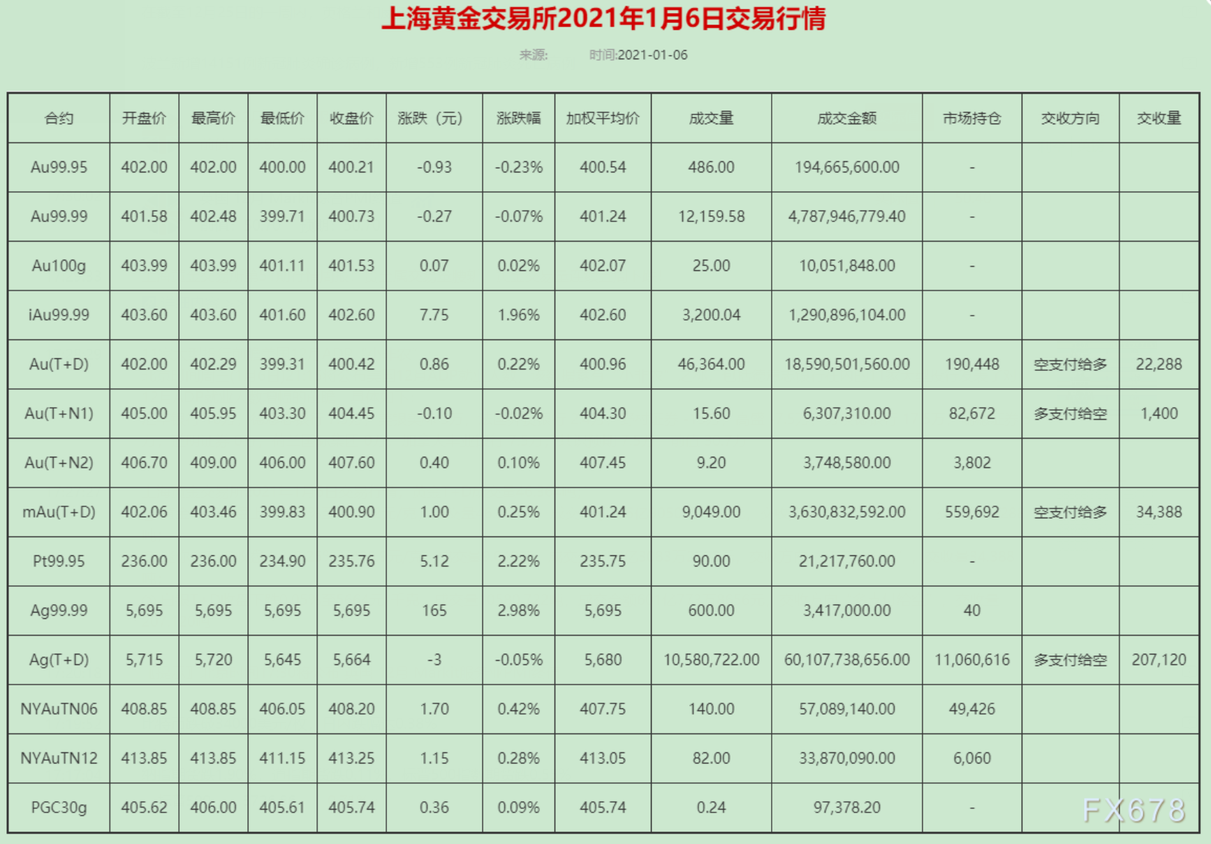 上海黄金交易所2021年1月6日交易行情,黄金T+D成交量46.364吨;
