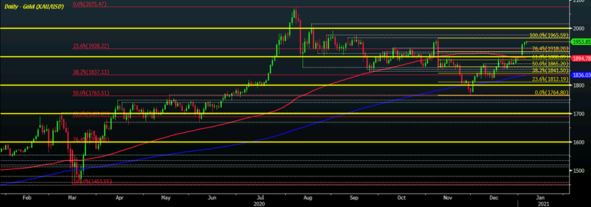 就目前而言,金价在今天早些时候开始交易时小幅下跌后又开始回升。目前金价正升至日高1940-1956美元附近,因多头继续瞄准11月初1960-1965美元的高位。