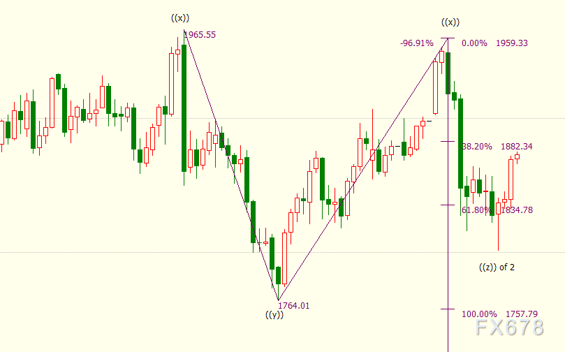((z))浪则隶属于自2075美元开启的调整2浪。日线图上看,2浪呈现三重三锯齿形结构,可细分为((w))((x))((y))((x))((z))五子浪。((z))浪的100%目标位在1758美元附近。