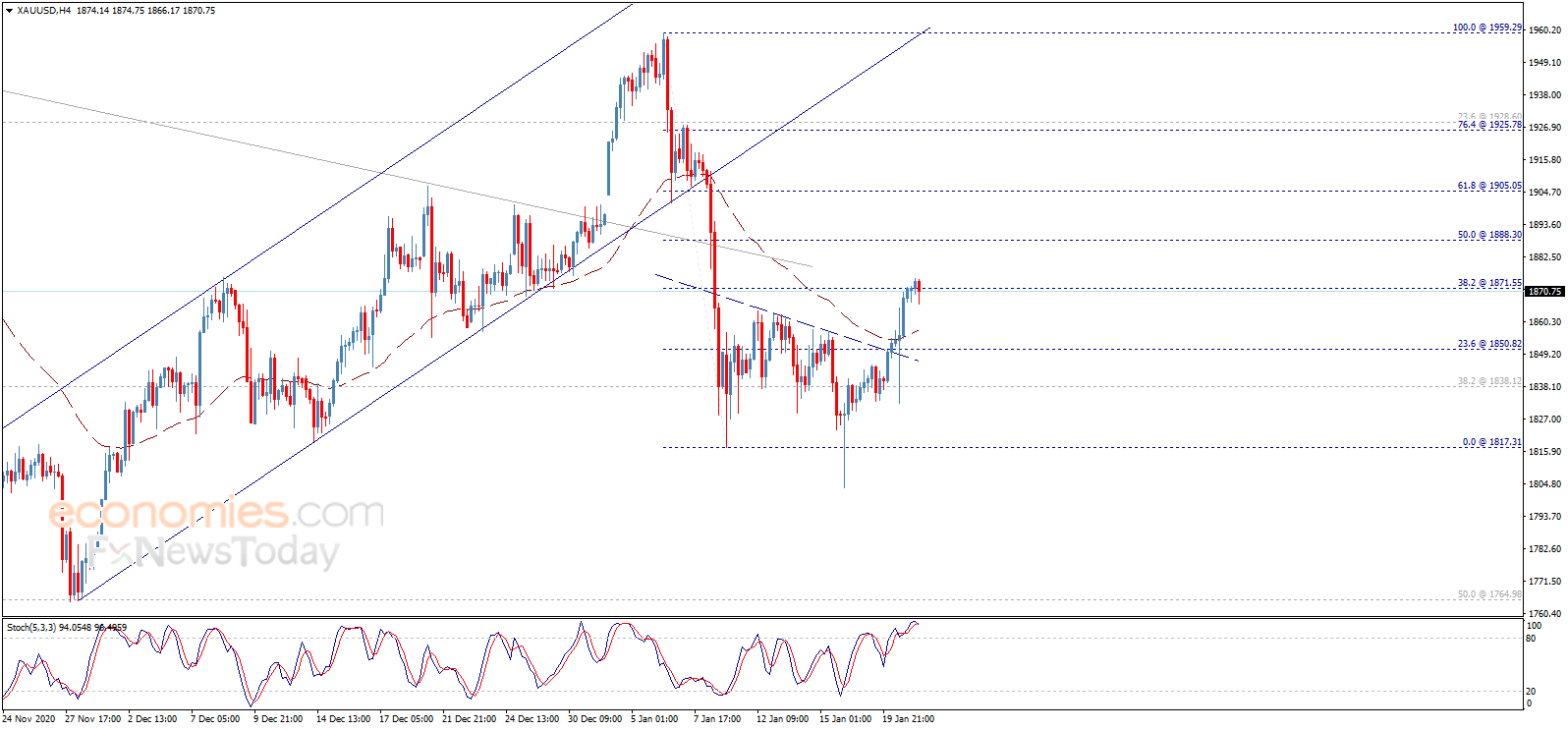 Economies.com在文章中写道,金价周四继续尝试突破1871.55美元/盎司,但金价在这一水平面临坚固阻力。