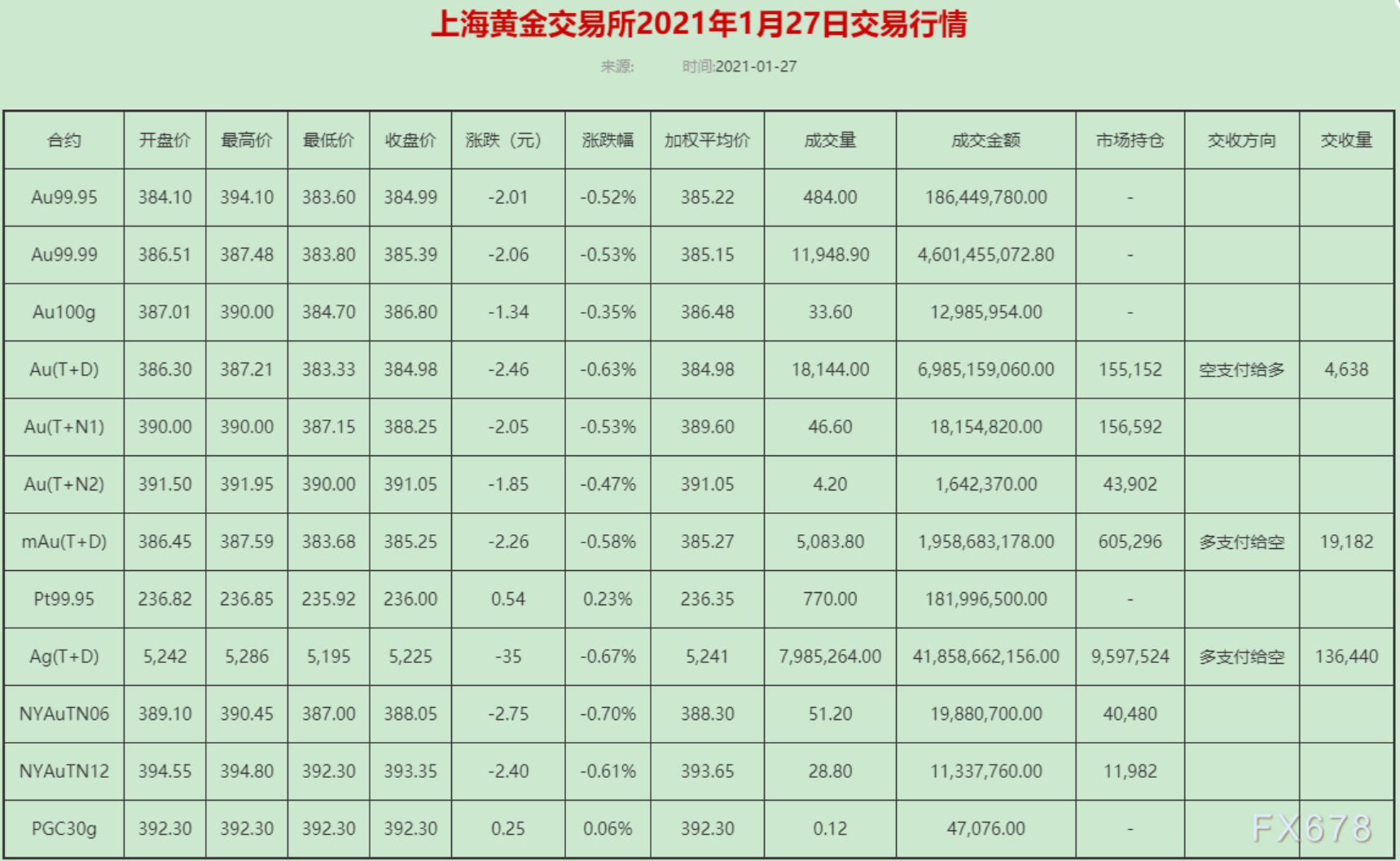 上海黄金交易所2021年1月27日交易行情,黄金T+D成交量18.144吨;