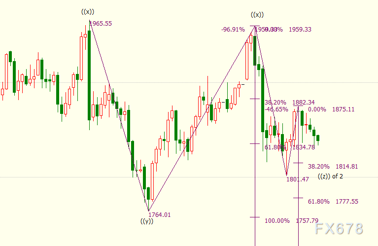 日线图上看,(c)浪是自1959美元开启的下行((z))浪的子浪,(c)浪的61.8%目标位在1778美元。((z))浪则隶属于自2075美元开启的调整2浪。2浪呈现三重三锯齿形结构,可细分为((w))((x))((y))((x))((z))五子浪。