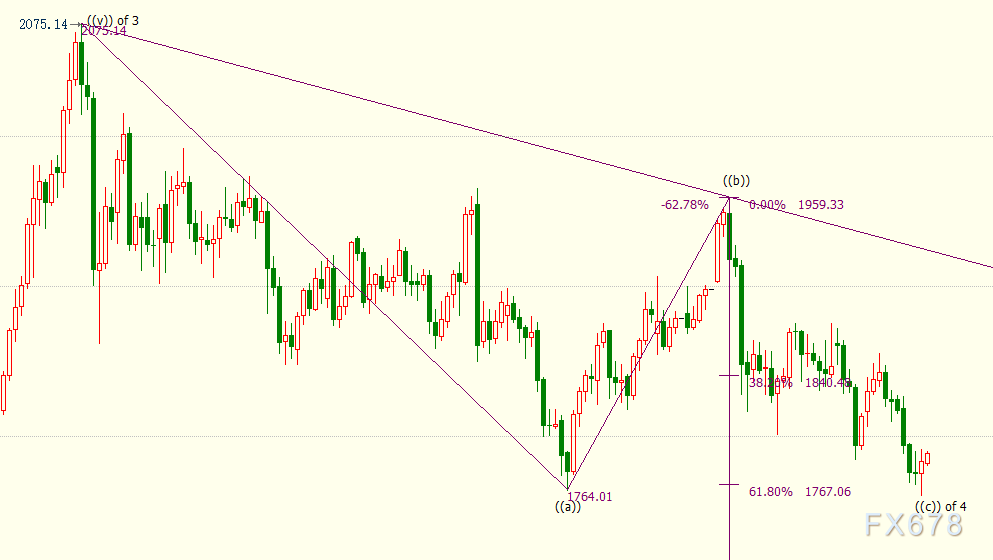 日线上看,((c))浪则是自2075美元开启的调整4浪的子浪。目前金价已经跌破((c))浪61.8%目标位1767美元,下一道支撑看向76.4%目标位1722美元。