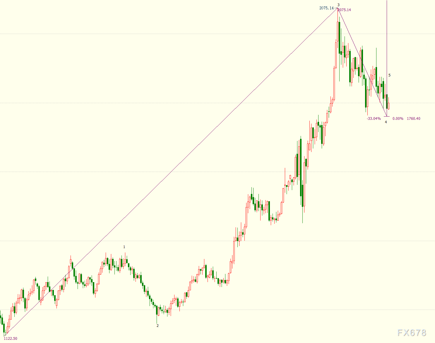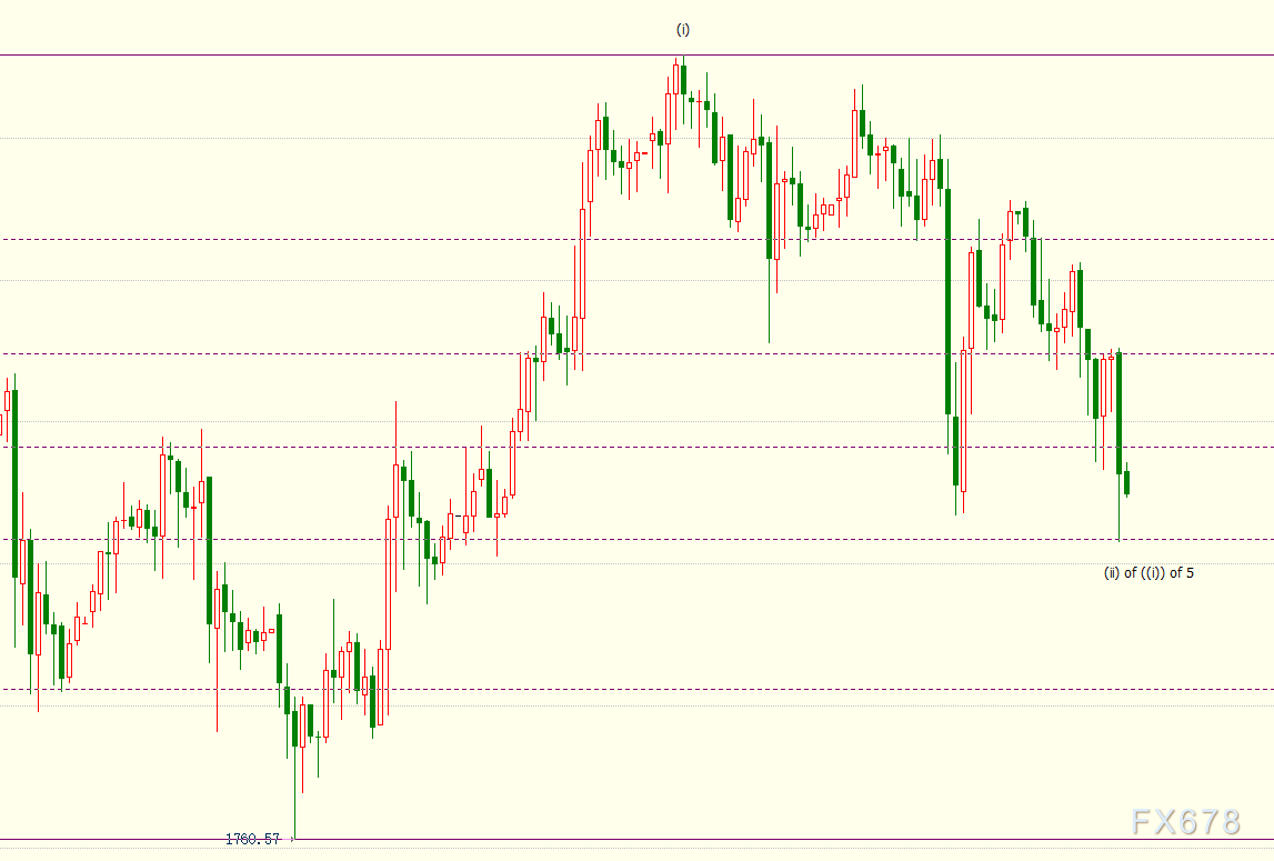 小时图上看,现货黄金自1816美元开启调整(ii)浪走势,并触及(i)浪61.8%斐波那契回档位1782美元,随时可能重新走强。(ii)浪和(i)浪都是是自1760美元开启的上行((i))浪的子浪。((i))浪则隶属于同样自1760美元开启的上行5浪。周线上看,5浪的14.6%目标位1899美元。