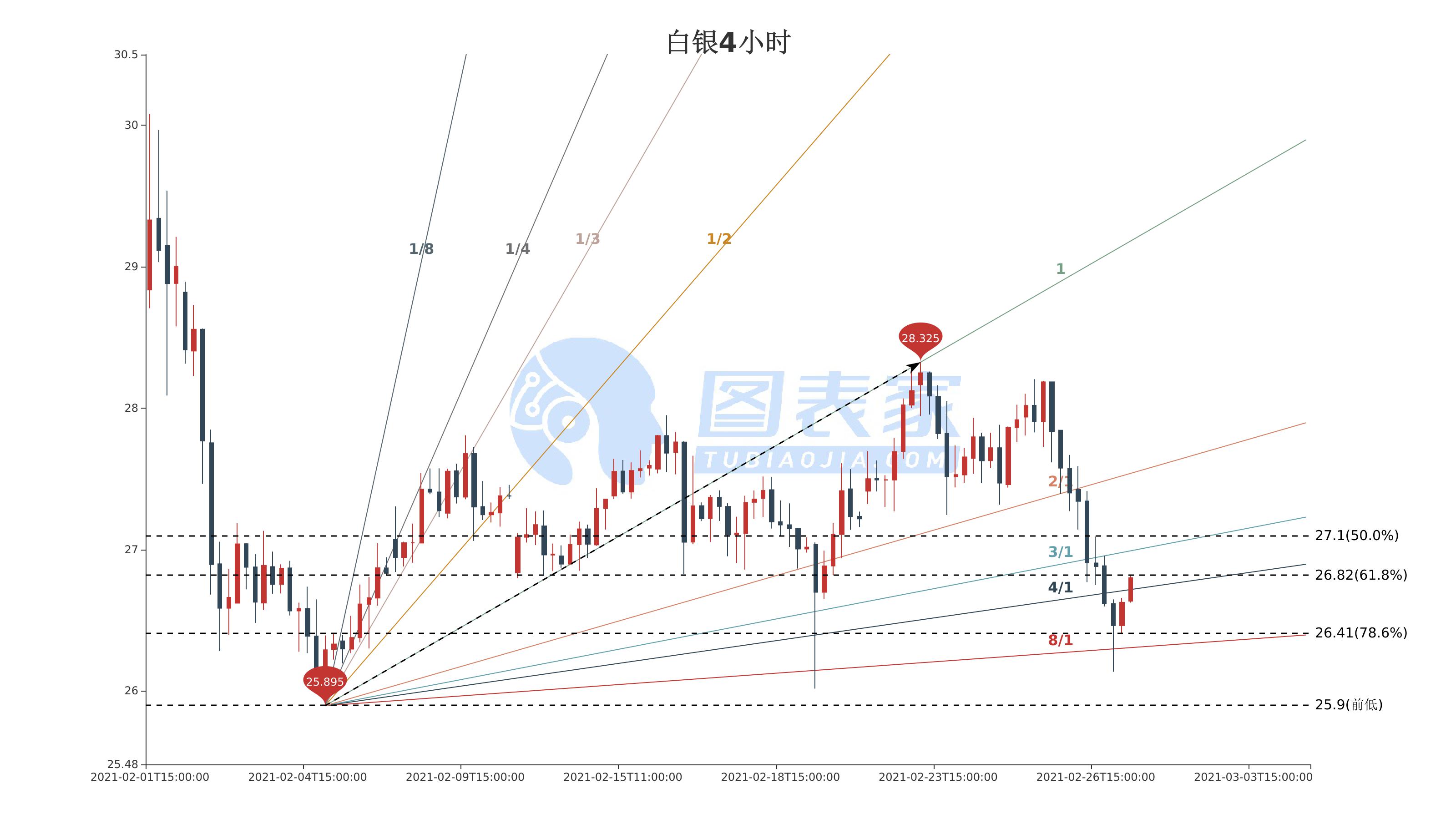 若价格上行,短线或测试26.82阻力,突破后盘中需关注3/1甘氏线,未来或将进一步测试斐波那契50.0%回调位27.1阻力。