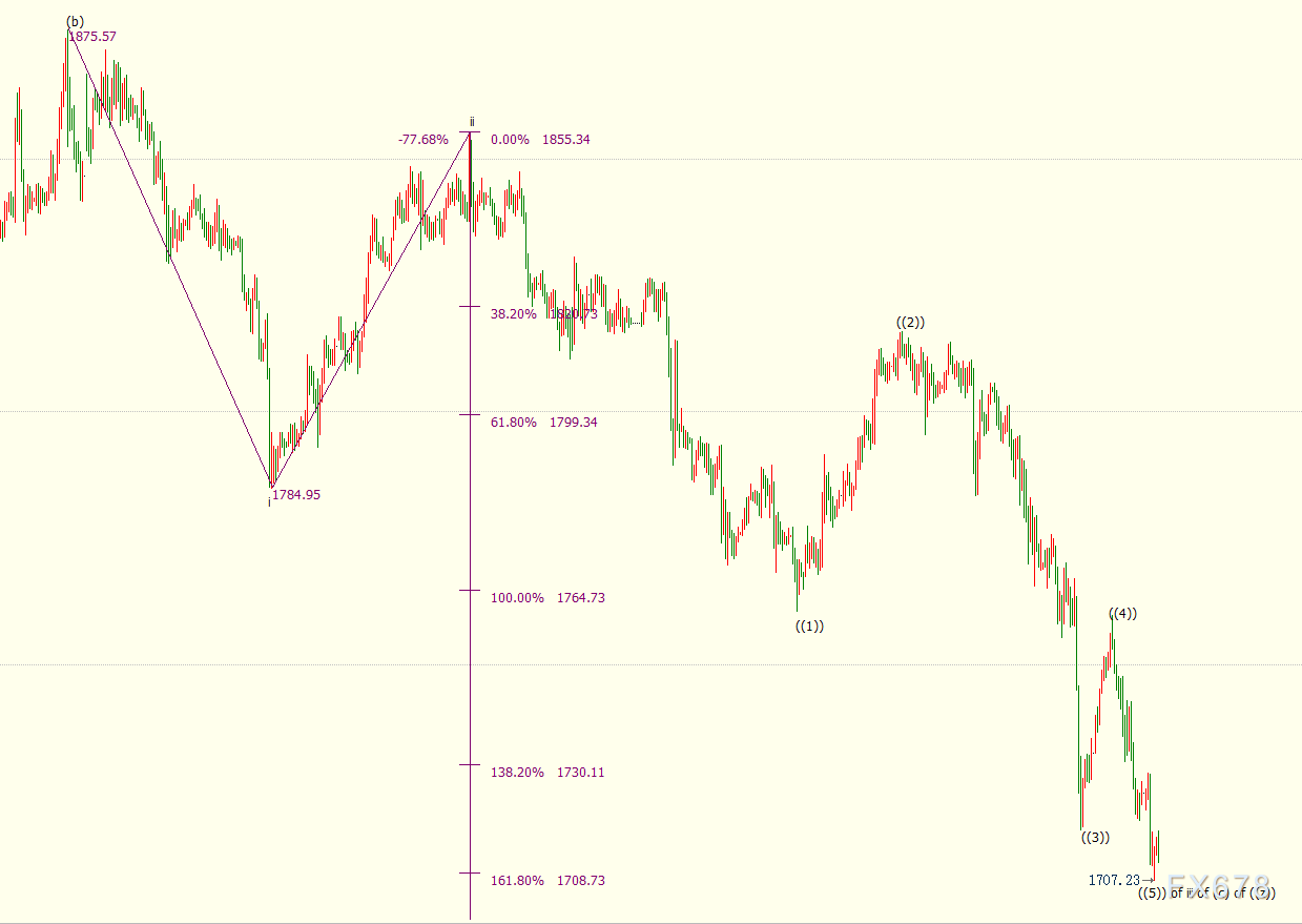 小时图上看,现货黄金处于自1855美元开启的下行iii浪中,金价已跌破其161.8%目标位1709美元。iii浪是自1876美元开启的下行(c)浪的子浪。若iii浪继续扩大,下方支撑看向176.4%目标位1696美元和185.4%目标位1687美元。