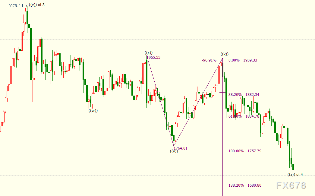 日线上看,(c)浪是自1959美元开启的下行((z))浪的子浪。((z))隶属于自2075美元开启的4浪调整走势,4浪呈现((w))((x))((y))((x))((z))三重“之”字调整模式。((z))浪已跌破123.6%目标位1710美元,下方支撑看向138.2%目标位1681美元。
