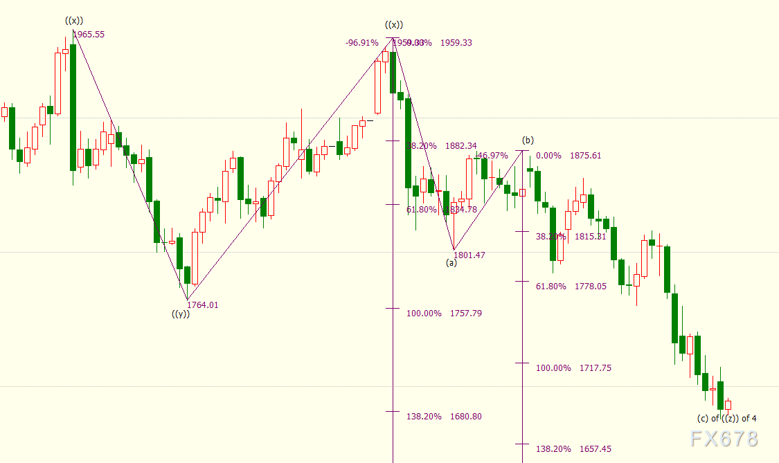 iii浪是自1876美元开启的下行(c)浪的子浪,(c)浪的138.2%目标位在1657美元。日线上看,(c)浪是自1959美元开启的下行((z))浪的子浪。((z))隶属于自2075美元开启的4浪调整走势,4浪呈现((w))((x))((y))((x))((z))三重“之”字调整模式。((z))浪料将138.2%目标位1681美元,并进一步下探150%目标位1657美元。
