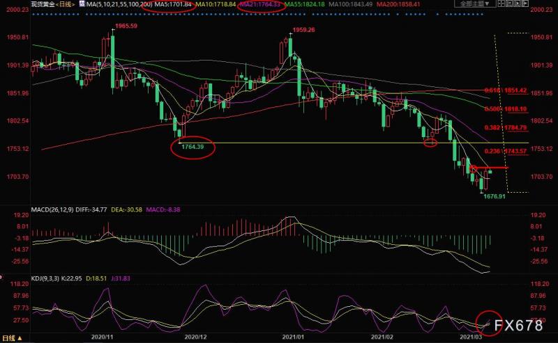 从日线图来看,单边下跌走势;KDJ低位结成金叉,K线“吞没”看涨信号,需要提防金价震荡筑底的可能性,初步阻力在3月4日高点1723.15附近,若能顶破该阻力,则增加短线看涨信号,1959-1677跌势的23.6%回撤位阻力在1743.57附近,强阻力在11月30日低点1764.39附近(接近20日均线)。2月19日低点1760位置也可以予以留意。