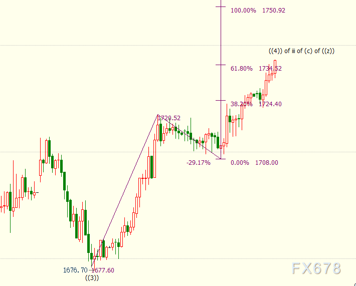 小时图上看,现货黄金处于自1708美元开启的反弹(c)浪中,目前升破61.8%目标位1735美元,下一道阻力上看100%目标位1751美元。(c)浪是自1677美元开启的反弹((4))浪的子浪。((4))浪是自1855美元开启下行iii浪的子浪。