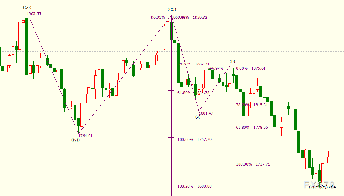 日线上看,iii浪是自1876美元开启的下行(c)浪的子浪,(c)浪是自1959美元开启的下行((z))浪的子浪。((z))隶属于自2075美元开启的4浪调整走势,4浪呈现((w))((x))((y))((x))((z))三重“之”字调整模式。((z))浪料将138.2%目标位1681美元,并进一步下探150%目标位1657美元。