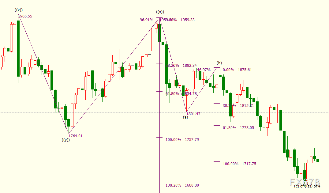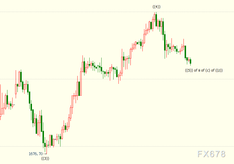 日线上看,iii浪是自1876美元开启的下行(c)浪的子浪,(c)浪是自1959美元开启的下行((z))浪的子浪。((z))隶属于自2075美元开启的4浪调整走势,4浪呈现((w))((x))((y))((x))((z))三重“之”字调整模式。((z))浪料将138.2%目标位1681美元,并进一步下探150%目标位1657美元。