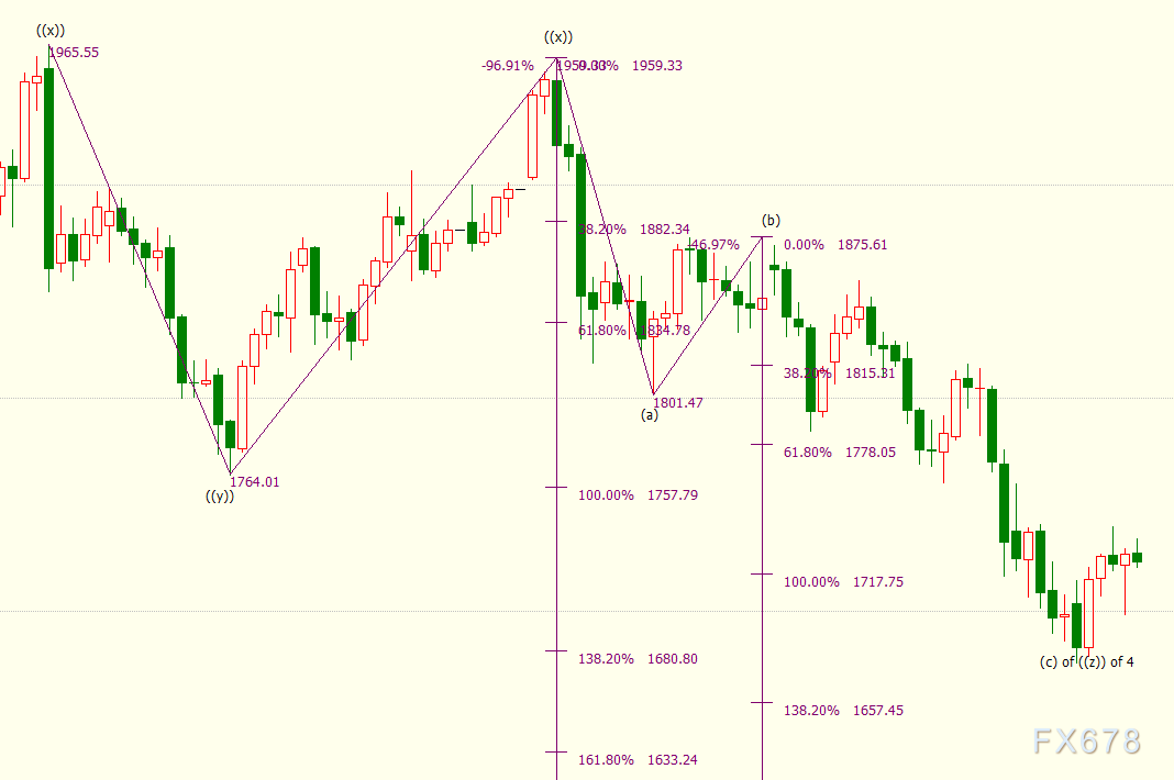 日线上看,iii浪和潜在iv浪是自1876美元开启的下行(c)浪的子浪,(c)浪是自1959美元开启的下行((z))浪的子浪。((z))隶属于自2075美元开启的4浪调整走势,4浪呈现((w))((x))((y))((x))((z))三重“之”字调整模式。((z))浪料将重新跌破138.2%目标位1681美元,并进一步下探161.8%目标位1633美元。