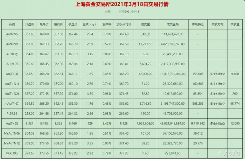 上海黄金交易所2021年3月18日交易行情,黄金T+D成交量42.096吨;