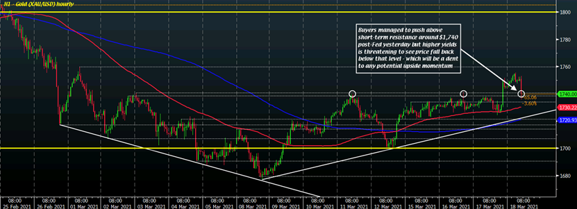 昨日美联储决议后,金价跳升至约1740美元的短期阻力位上方,但买家从未真正尝试过冲向1760美元,且随着公债收益率(殖利率)飙升,金价上涨动能可能开始消退。