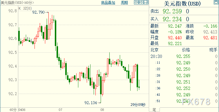 现货黄金上涨0.63%至1748.88美元/盎司;COMEX期金主力合约上涨0.48%至1749.8美元/盎司;美元指数下跌0.18%至92.249。