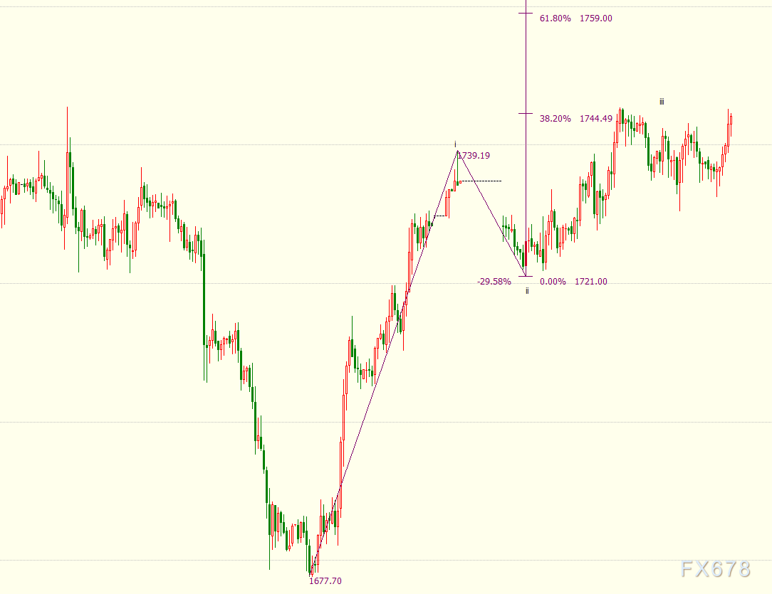 小时图上看,现货黄金仍处于自1721美元开启的上行iii浪中,并重新升破38.2%目标位1744美元,下一道阻力位上看61.8%目标位1759美元。日线图上看,金价自1677美元开启上行5浪走势。5浪是自1123美元开启上行(3)浪的子浪。