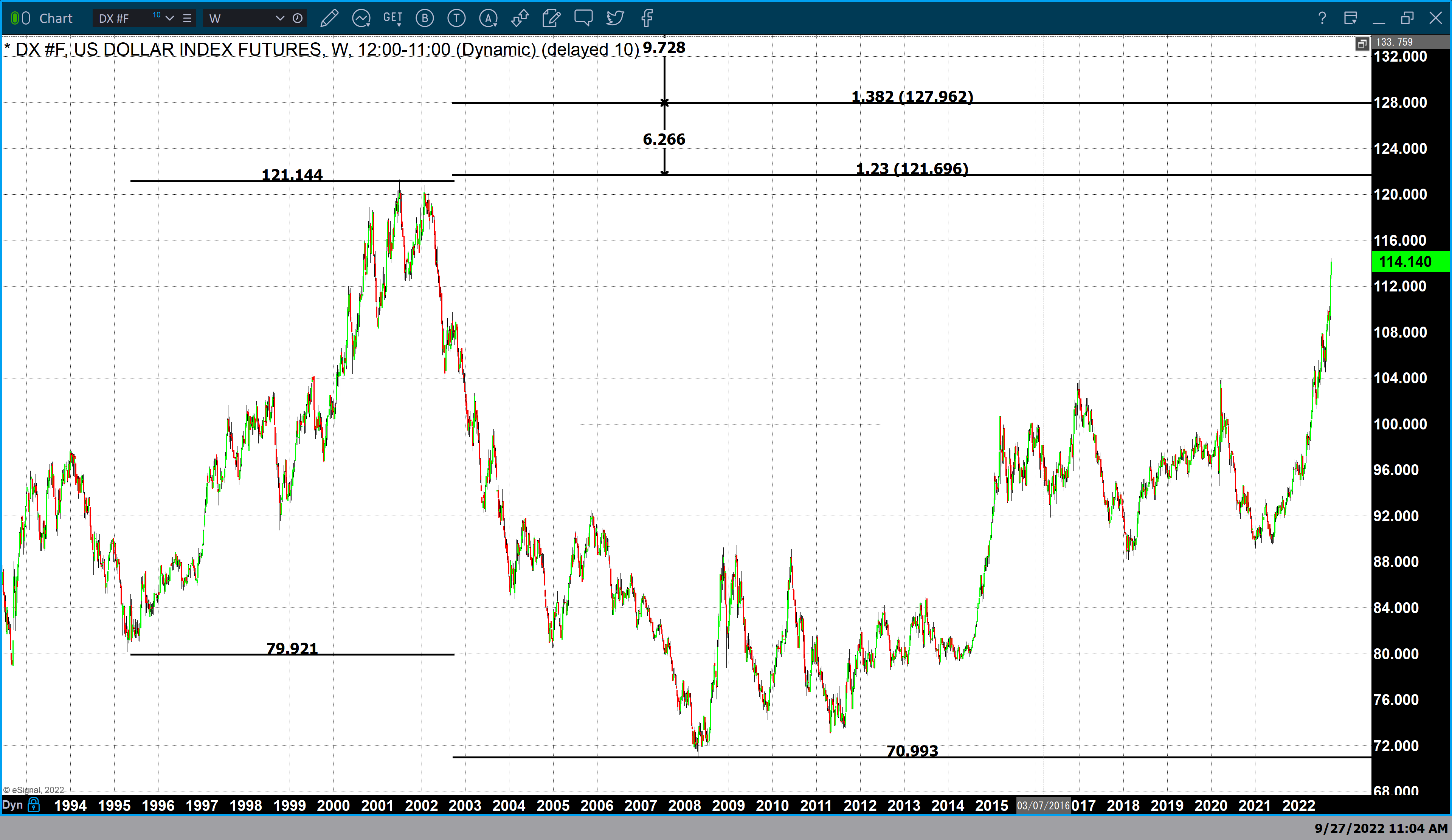 随后的反弹一直持续到2002年,当时美元指数达到121.144。第三个价格点是修正的结论,该修正始于121.144,发生在70.993。在这项研究中,我们正在研究斐波那契延伸的潜力,即1.23%,发生在121.696,或1.382%,发生在127.962。