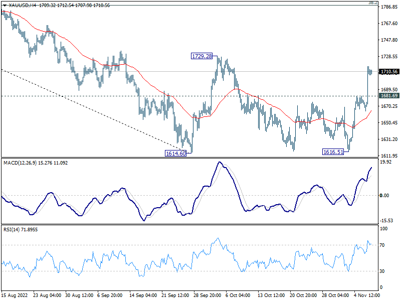 现在的焦点是黄金的1729.28阻力位。决定性突破将完成双底形态(1614.60;1616.51),这至少是一个近期看涨信号。至少在1788.58,2070.06至1614.60的38.2%回撤位应会看到更强劲的反弹。尽管如此,突破1681.69小支撑位将保持近期看跌,并首先转为偏斜。