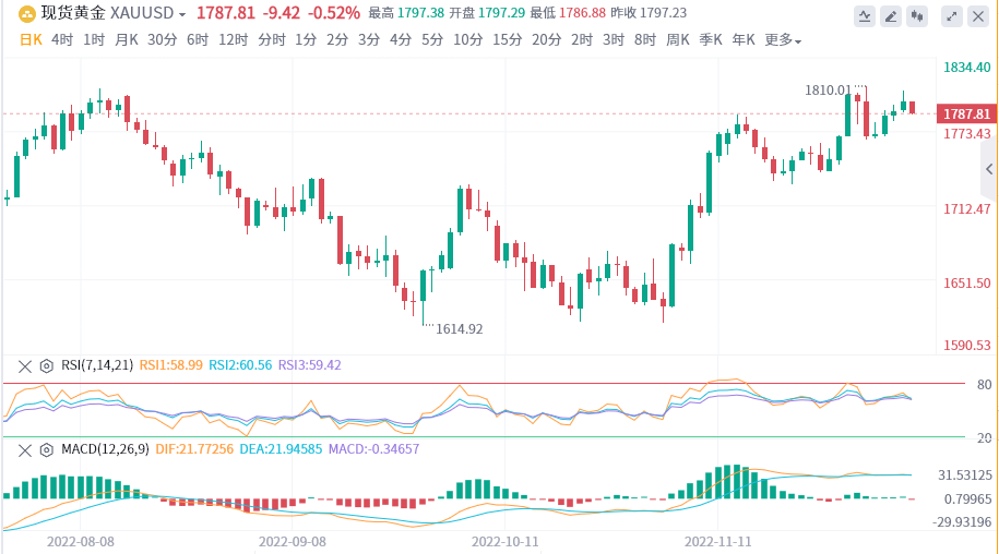 突破1797美元/盎司可能会导致进入1806—1816美元/盎司的区间。在日线图上,黄金仍在1788美元/盎司附近盘整。