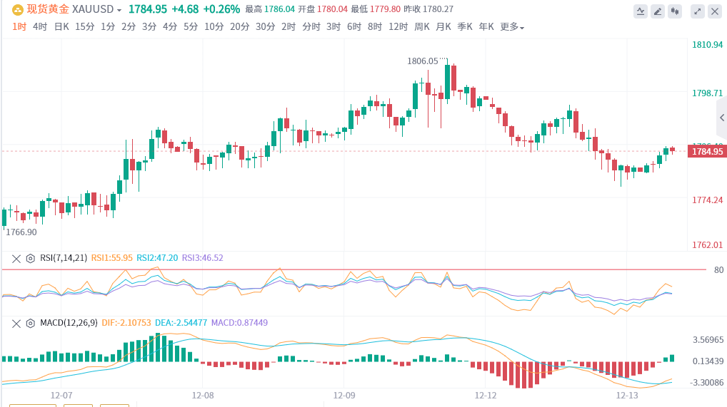 尽管多头坚持不懈,但仍未能将金价推向12月5日的高点1809.91美元/盎司之上。在周一的下跌之后,围绕1788美元/盎司的盘整似乎正在结束。