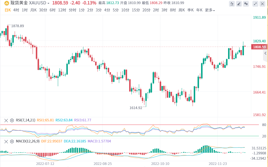 近期支撑位在1806美元/盎司,跌破后可能会跌至1788—1797美元/盎司的区间。