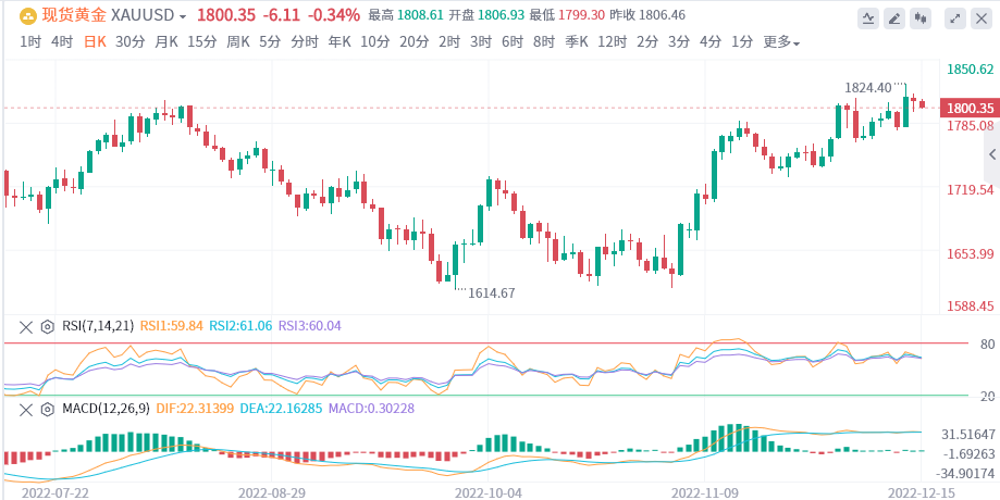 周四凌晨美联储利率决议公布后,金价有所走低,但不足以劝阻黄金多头或鼓励黄金空头。美联储在连续4次加息75个基点后,决定今年最后一次加息50个基点。在加息的同时,鲍威尔表示,美联储预计将在明年保持较高的利率,直到2024年才会降息。然而,金价仍守在1800美元上方,这可能是今年影响金价的最后一个重大事件。预测只要金价能突破1825美元,将上看下一多头目标1865美元,而在该水平我们将观察上行趋势是否能得以继续维持,或者届时将出现潜在的趋势逆转信号。。