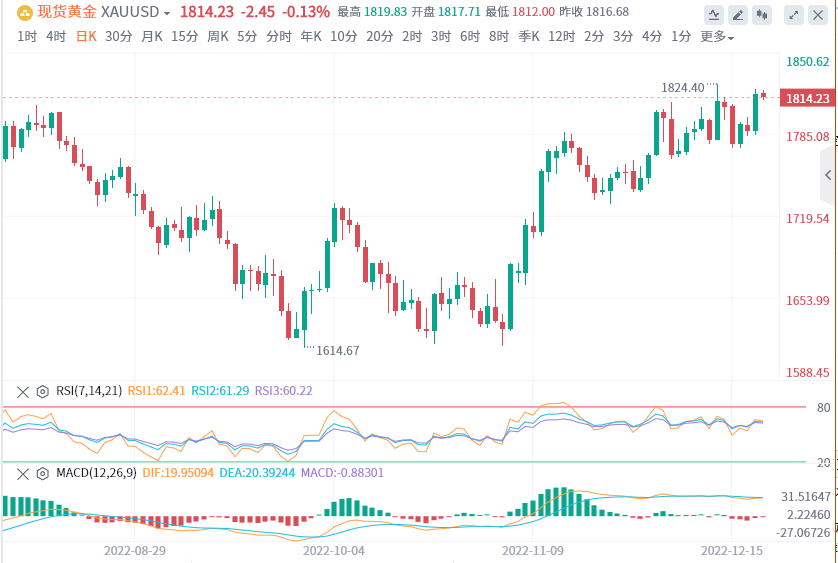 截至发稿时,黄金价格接近五周上升楔形看跌图表模式的上限,约为1823美元/盎司。然而,值得注意的是,14天相对强弱指数表明黄金上行空间有限,现已接近超买区域。与此同时,MACD移动平均线发出疲弱信号,对金价的进一步上涨构成了挑战。因此,至少目前,金价上行空间似乎被限制在1825美元下方。然而,若金价有效突破上述阻力位,将打破看跌趋势,并可能迅速推动金价向6月高点1880美元/盎司靠近。