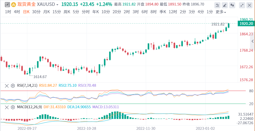 现货黄金周五收报.56美元/盎司,大幅上涨22.66美元或1.19%,日内最高触及1921.94美元/盎司。本周,现货黄金大涨55.11美元,涨幅达到2.96%。