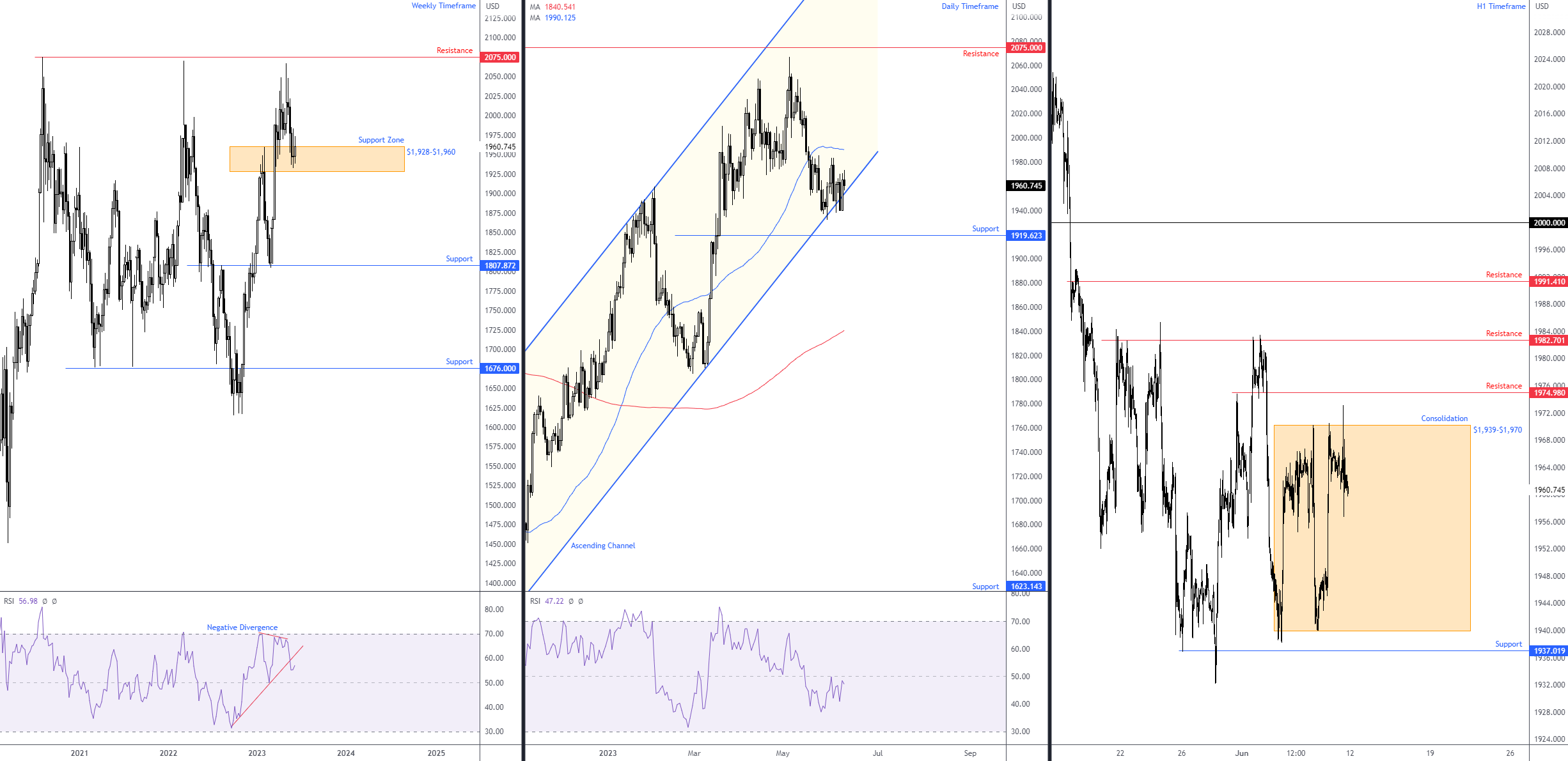 日线图:现货黄金自5月中旬以来就没有太多表现,受到从1616美元开始的通道下沿的支撑区,价格徘徊在1978-1940美元之间。另外,50日简单移动平均线位于上述区间的上方,当前为1990美元,如果本周跌破通道支撑位,则需要关注美元的支撑。虽然自2022年9月触底以来,金价在周线图上移至处在上升趋势中,但日线图已经显示出处于下降趋势的早期阶段。跌破当前的通道支撑可能会加强这种下行趋势。RSI仍然在50中性水平以下运行,这告诉市场参与者价格偏向于下跌,与目前日线图上的下降趋势一致。