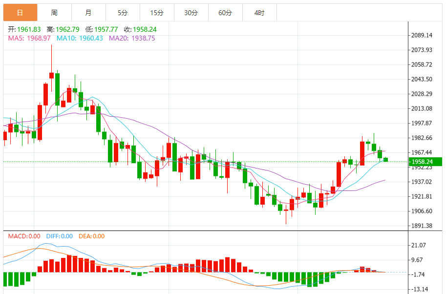 由于MACD金叉信号仍在,10日均线仍给金价提供支撑,若能回升至5日均线1969.35上方,则略微削弱短线下行风险;进一步阻力参考1980关口,强阻力继续参考50%回撤位1985.98附近位置,若能强势顶破该阻力,则有望看向2000关口上方。