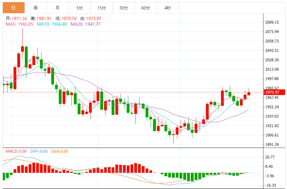 日线级别:震荡上涨;MACD金叉,KDJ的死叉有被破坏的趋势,金价站在所有均线上方,在失守5日均线1965.80前,后市略微偏向震荡上行,关注2079-1892跌势的50%回撤位1986.07附近阻力,过去两个多月,金价多次在该位置受阻,若能顶破该阻力,则有望打开新的上涨通道,后市有望进一步涨向61.8%回撤位2008.10附近。