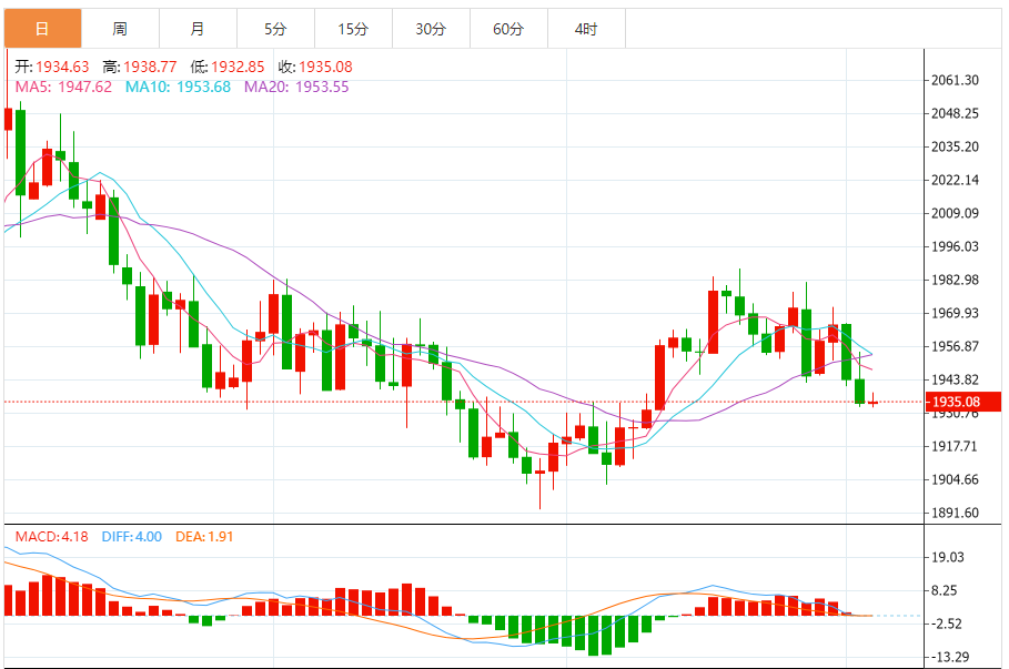 若金价意外回升至55日均线上方,则削弱短线看空信号;进一步阻力参考10日均线1953.47附近,隔夜高点阻力也在该位置附近,然后是1960关口附近阻力,强阻力在100日均线1968.51附近位置,若能顶破该阻力,则增加后市看涨信号。