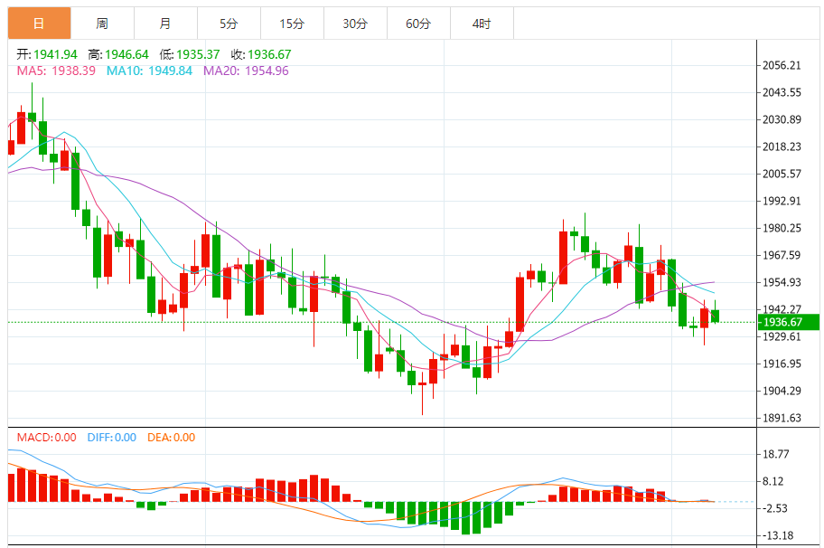 由于KDJ也发出了短线超卖信号,上周五金价探底回升,十字星K线后紧跟阳性,暗示短线多头机会有所增加,若能顶破布林线中轨阻力,则有望进一步试探21日均线1953.54附近阻力,然后是1960关口,强阻力在100日均线1968.27附近,若能顶破该阻力,则增加后市看涨信号。