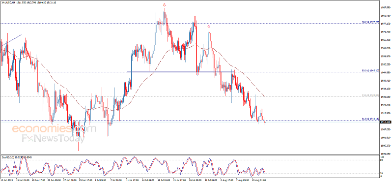 周一(8月14日)欧市早盘,现货黄金维持日内跌势,金价现报1912美元/盎司附近。根据Economies.com,金价刚刚跌破支撑位1913.15美元/盎司,若保持在该位下方,这可能推动金价进一步下滑。