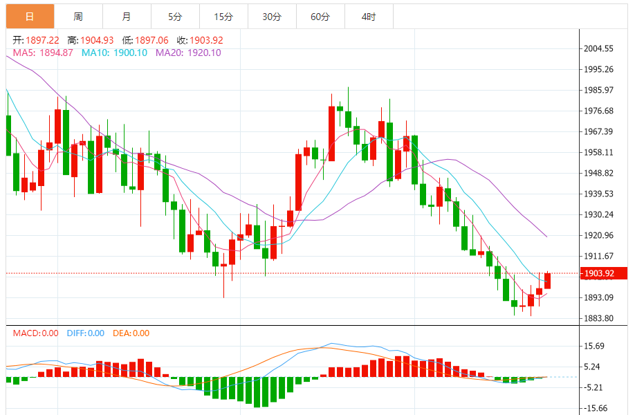 当前金价4小时价格略高于前4小时收市价,呈现小幅上涨走势。该价格也略高于50-4小时移动均线1900.51美元,表明潜在的短期看涨势头。