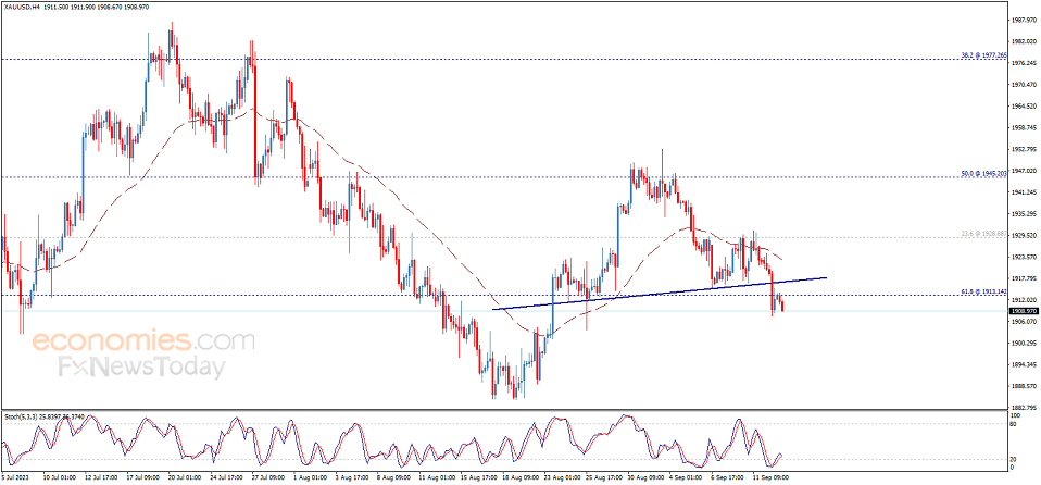 周三(9月13日),现货黄金维持日内跌势,金价目前略低于1910美元/盎司关口。根据Economies.com,金价完成头肩顶这一重要看空技术形态的构建,这暗示金价后市可能进一步大跌。