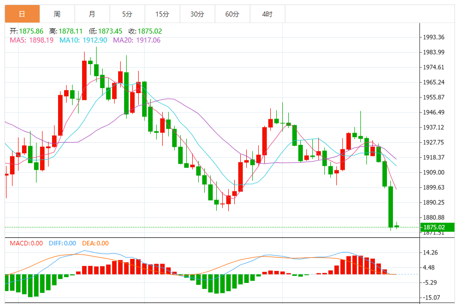 现货黄金周三收市大跌25.61美元,跌幅1.35%,收报1874.83美元/盎司。
