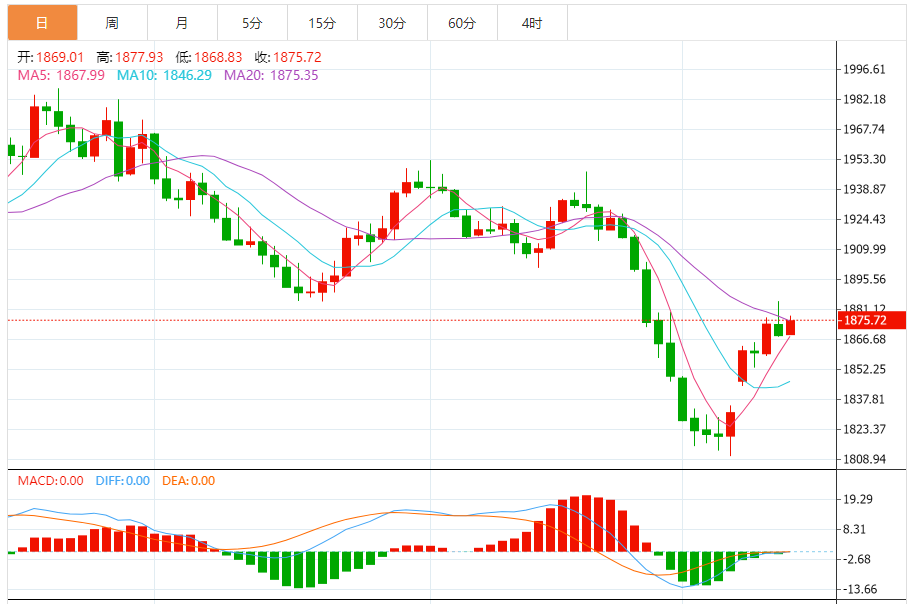 周五(10月13日),现货黄金短线突然一波明显拉升,金价刚刚突破1876美元/盎司,刷新日内高点。