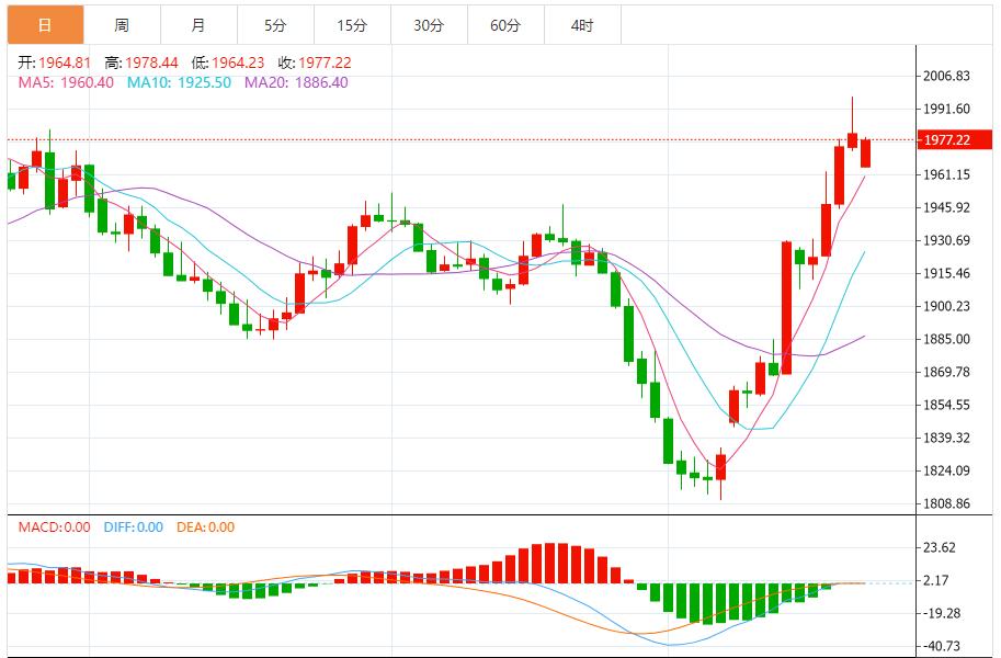 预计,今日金价交投将于支撑位1960.00美元/盎司以及阻力位1995.00美元/盎司之间。