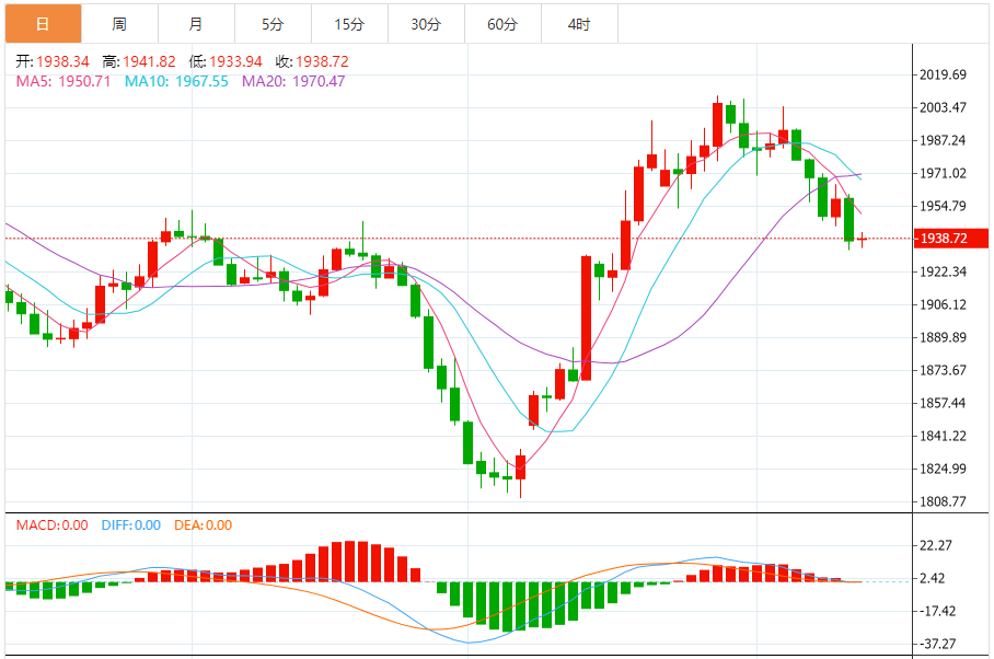 现货黄金上周五收市大跌20.38美元,跌幅1.04%,收报1938.07美元/盎司,金价盘中最低触及1932.99美元/盎司。