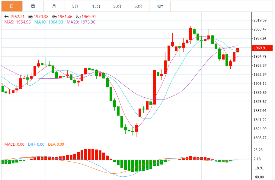 预计,今日金价交投将于支撑位1950.00美元/盎司以及阻力位1980.00美元/盎司之间。