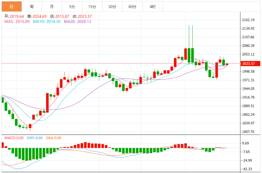 预计,今日金价交投将于支撑位2010.00美元/盎司以及阻力位2045.00美元/盎司之间。