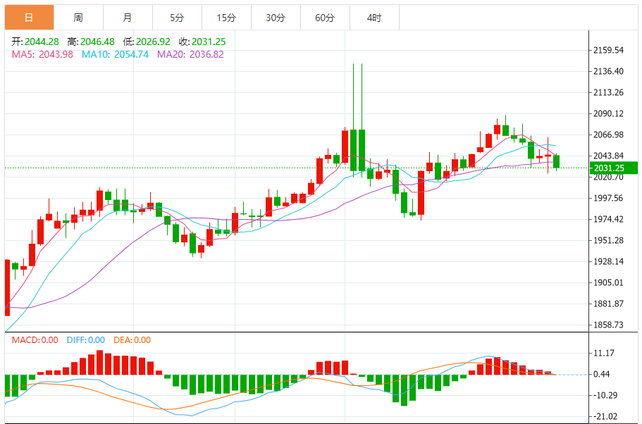 预计,今日金价交投将于支撑位2015.00美元/盎司以及阻力位2055.00美元/盎司之间。