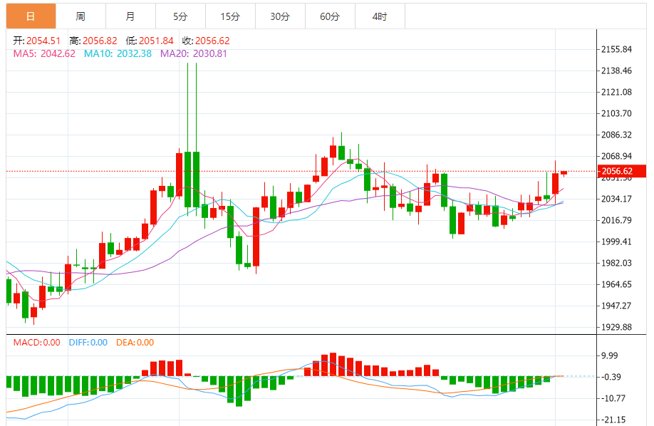 金价短期强劲阻力位见于2070美元/盎司附近,若攻克该位,那么2080美元/盎司心理位将构成障碍。从更上方来看,黄金多头将瞄准去年12月28日高点2088美元;目前来看,金价仍是处在震荡上升的格局当中,低点在不断抬高,高点也在不断刷新新高!目前均线金叉持续运行,金价受到底部趋势线以及均线双重支撑的影响下,很明显跌不下去,日内稍微调整之后将会再次拉升走高!