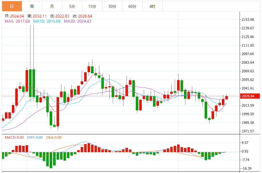 预计,今日金价交投将于支撑位2015.00美元/盎司以及阻力位2050.00美元/盎司之间。