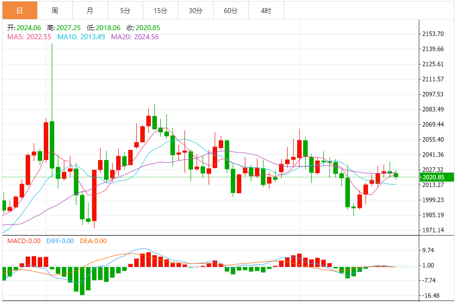 预计,今日金价交投将于支撑位2015.00美元/盎司以及阻力位2045.00美元/盎司之间。